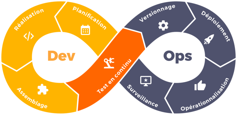 Les deux activités de Dev et d’Ops représentées sur le logo finissent par se confondre étant donné que chaque étape est liée.
