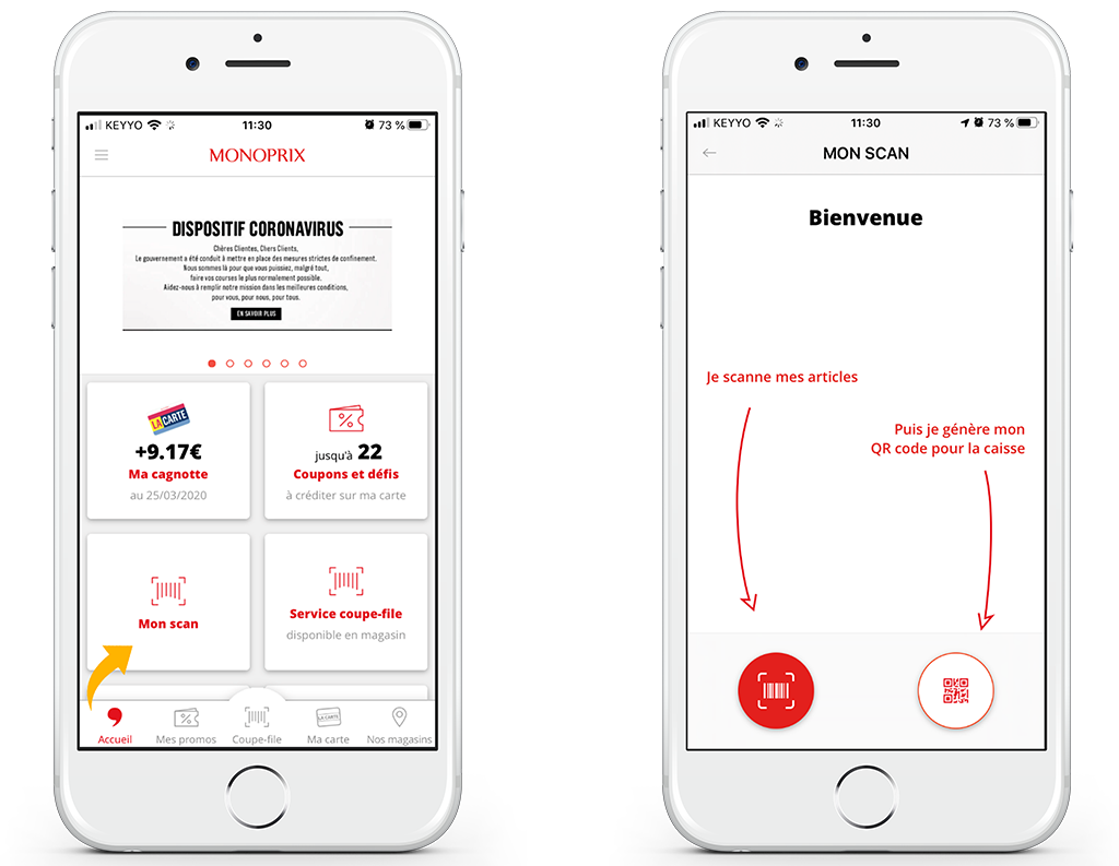 Cette nouvelle fonctionnalité « MON SCAN » accessible depuis la page d’accueil de l’application, permet de fluidifier le parcours client en magasin et en caisse tout en limitant les contacts produits et les interactions entre personnes.